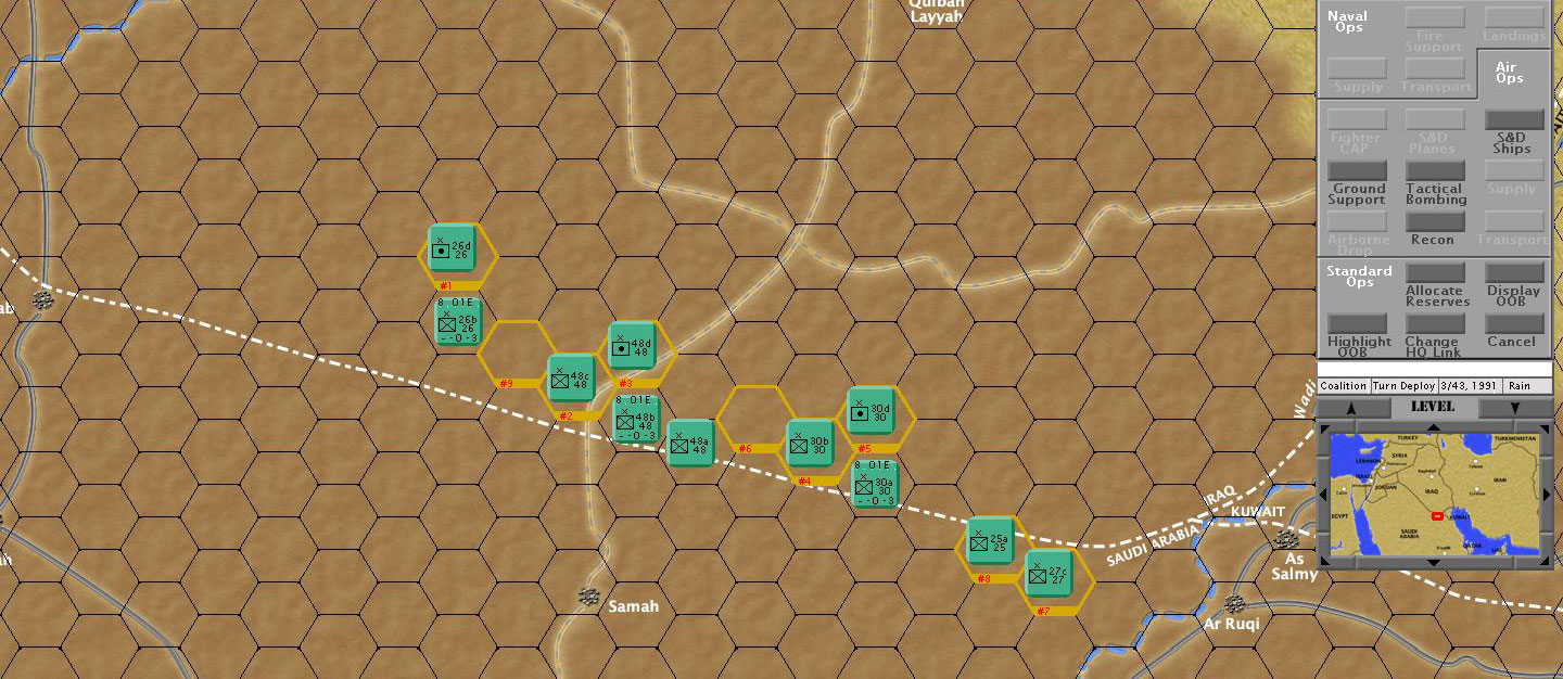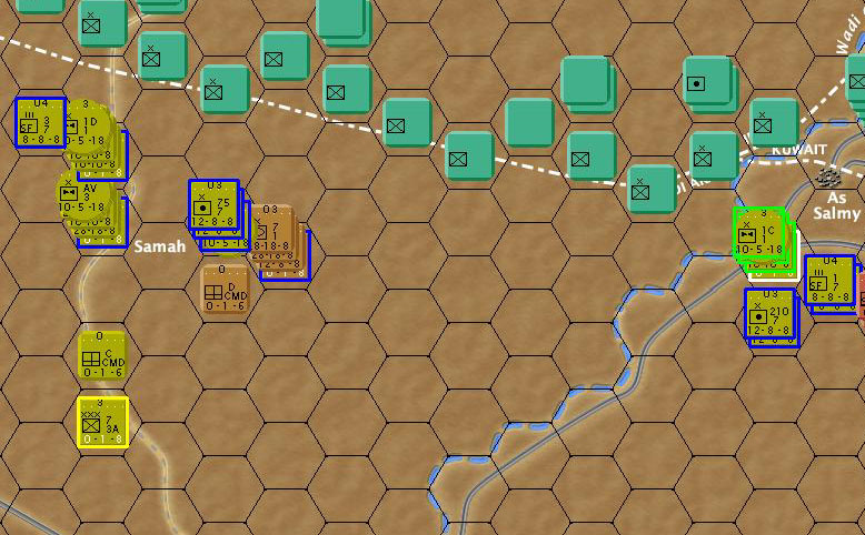 Right click and open in a new window for a better view. The 1st US Cav (counters outlined white and green) are spread thin for this screen mission. The rest of VII Corps (HQ counter highlighted yellow) is moving north, pushing aside the Iraqi infantry brigades found in its path. Green counters = US, Brown Counters = UK, Light Green (Teal?) = Iraq, Other counters south of the border = Rest of the Coalition.
