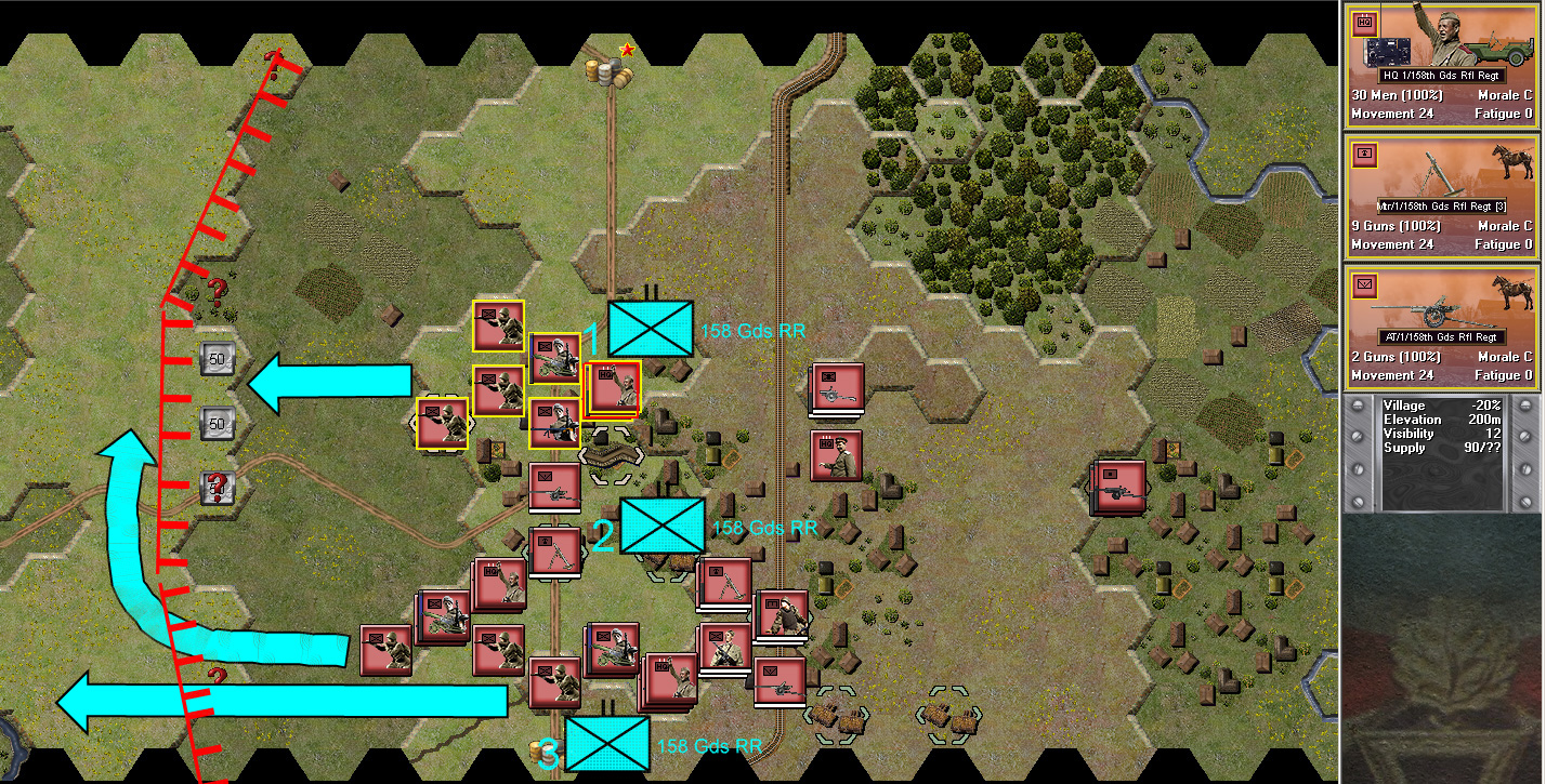 From the scenario briefing:Teterevino South, South of Prokhorovka: July 8th, 1943. (Scenario Size: Regiment. Soviet Human vs German AI) Major Mikhail Konstantinovich Belov had been given very clear orders. His 158th Guards Rifle Regiment had regrouped at Tetrevino South and was to attack Luchki South from the East. Voronezh Front intended this to be a diversionary attack, hopefully pinning or dragging away reserves from other parts of the German line. The assault would not be easy. The Guardsmen had to cross a deep, kilometre wide valley before assaulting the defenders on Hill 210.7. After breaking through they were to move towards the town and capture the bridge crossing the Donets and clear the town of any remaining enemy. Voronezh Front had provided both air and artillery support in the hope that the attack would be considered a major thrust rather than the intended demonstration.
