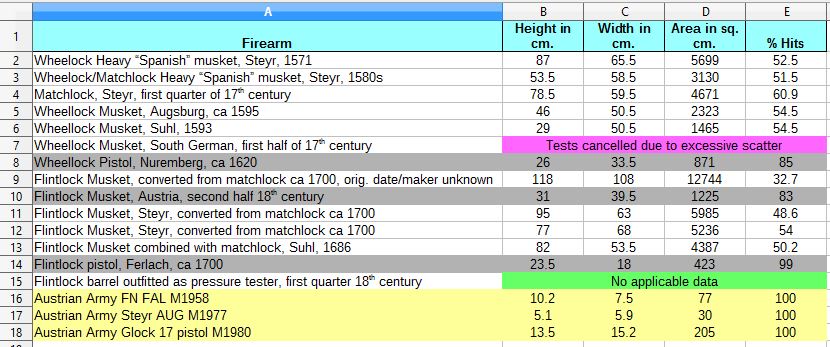 7.   The wheellock musket made in Southern Germany in the first half of the 17th century shot so inaccurately, that the tests for it were cancelled. This is shown in the chart with pink background and the words "Tests cancelled due to excessive scatter".