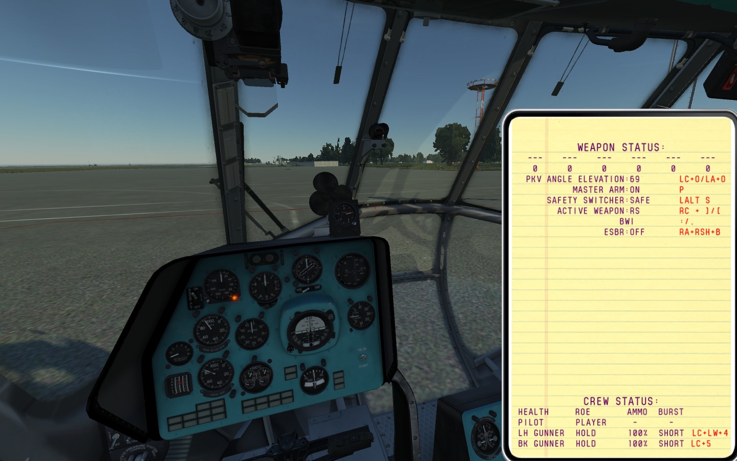 To add these gunners, one has to create a new loadout via the mission editor. Also, the best way to manage the crew is via the kneepad (shown above). Make sure that you set their rules of engagement accordingly using [LCtrl]+[LWin]+[4] for the left gunner and [LCtrl]+[5] for the back gunner.