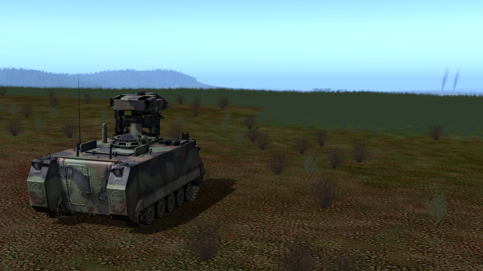A FISTV and a M113 PC, facing some unknown danger to their north, just behind that hill.