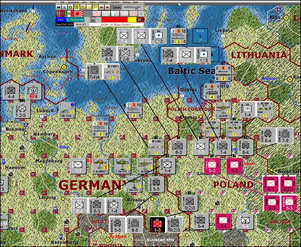 Mercifully, after the Allies moved in impulse #5, the weather turned Fine again (impulse #7).  Still, attacking both Lodz and Warsaw wasn’t really feasible.  Those attacks could have been executed, but a failure of the attack on Warsaw would have made taking it out in the first turn impossible, since the German units would have been disorganized.  Instead I chose to just kill off the Polish unit in Lodz and prepare for an attack on Warsaw from 6 hexes in the following impulse.  In the meantime, the Fine weather meant that Germany declared war on Denmark and captured both minor ports and Copenhagen as planned.