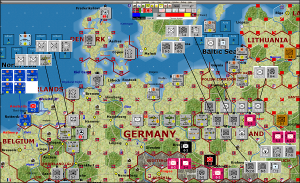 The first screenshot (Figure 2-1) shows the position with Germany deciding about declarations of war at the beginning of the third impulse of the first turn.  G’s setup was a common solid defensive position for the Polish land units while the air units were placed out of harm’s way in far northeastern Poland.  The air units rebased to a neutral minor country during the second (Allied) impulse, thereby becoming ‘interned’.  That permanently removed them from the game, but gave the Commonwealth two additional pilot units arriving in Great Britain at the start of the second turn.