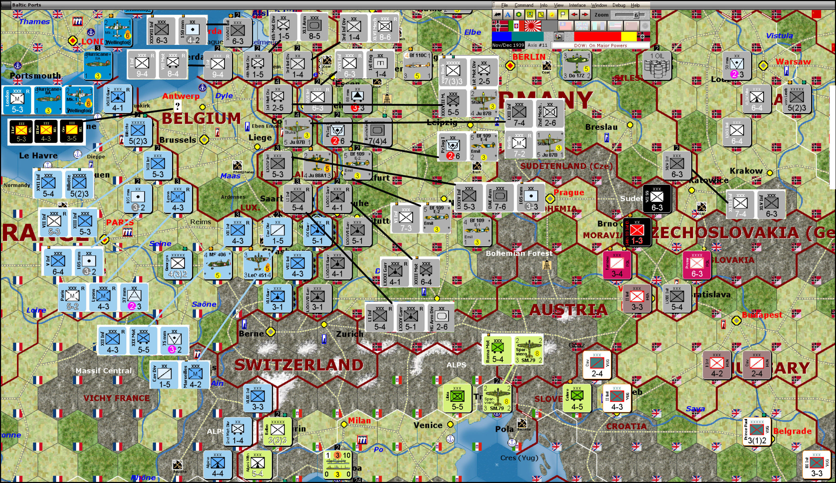 The Germans were able to conquer Denmark on schedule in Sep/Oct 1939.  But the conquest of Poland was delayed until Nov/Dec 1939.  That persuaded Germany (and Italy) to declare war on Yugoslavia and then align Hungary.  All of which was helpful for the Allied cause.  In recompense, the gods of chance had the second turn run long with good weather, letting the Germans conquer both The Netherlands and Belgium in 1939.  As a coup de gras for the Lowlands, the Axis ended the second turn at the best possible time and moved first in the third turn (Jan/Feb 1940), thereby occupying all of Belgium.