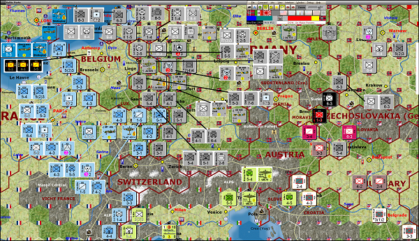 If you look over to the southeast on the screenshot, you will see that both Hungary and Yugoslavia have entered the war.  Italy, although not at war with France or the Commonwealth, is at war with Yugoslavia.  All of this came about because of the two annoying Polish units that survived the first turn.  In order to protect Vienna and Bratislava, I had to align Hungary to Germany.  But that wasn’t permitted unless Germany was at war with Yugoslavia.  While trying to prevent the Poles (and the Yugoslavians) from taking out German cities, and concurrently preventing dangerous Allied counterattacks, the Axis forces are poorly positioned in Austria and Czechoslovakia.  Poland will be conquered at the end of the turn, which will remove the last two Polish units from the map.  Until then, they needed careful monitoring.  MWIF is never easy - even with mostly good die rolls.