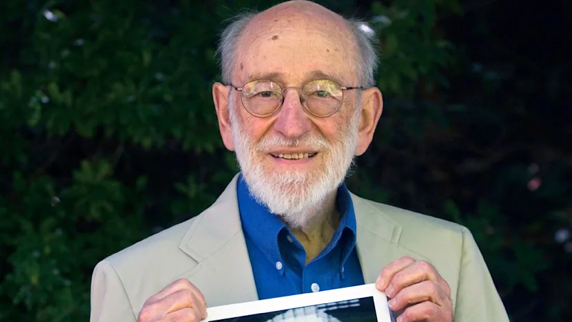 Russell Kirsch holding the image of his son, Walden, that was scanned into the world’s first digital scanner in 1957 Credit: Jamie Francis/The Oregonian via AP, File