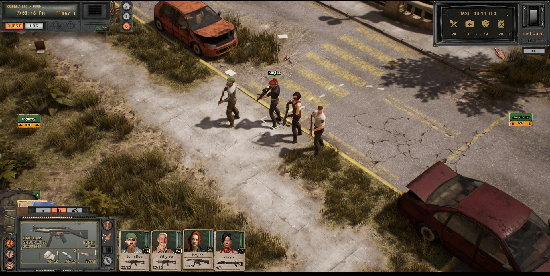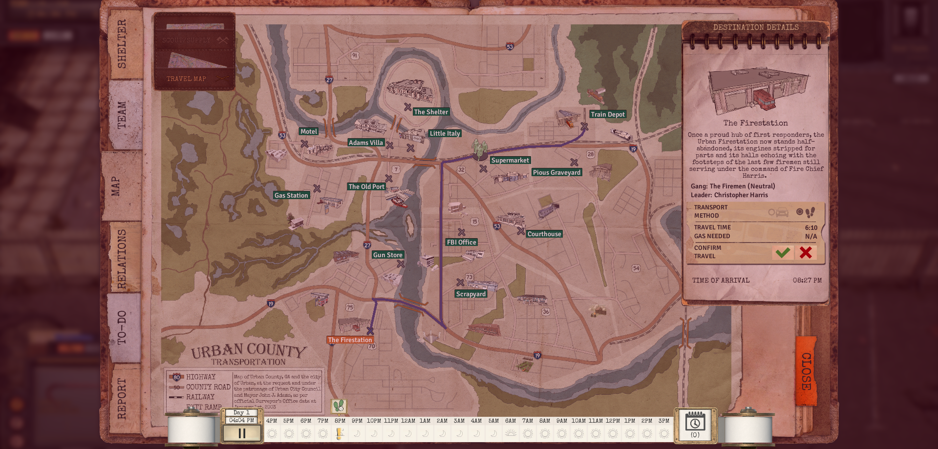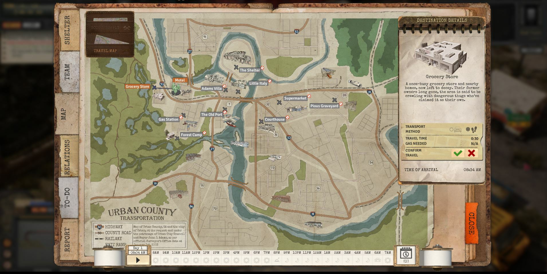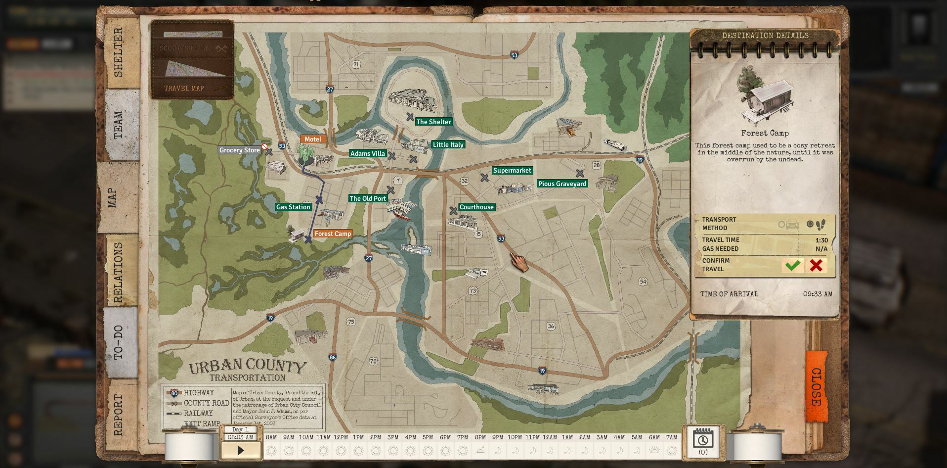 Your team and enemy factions (soon) will be able move between unlocked locations via vectorial routes. This is the first major step toward the dynamic endgame campaign we envisioned, allowing full simulation of faction wars ? human groups attacking each other and zombie hordes ravaging settlements regardless of allegiance. The travel times are now accurately scaled and that will allow us to estimate a campaign duration and rebalance the resources accordingly.