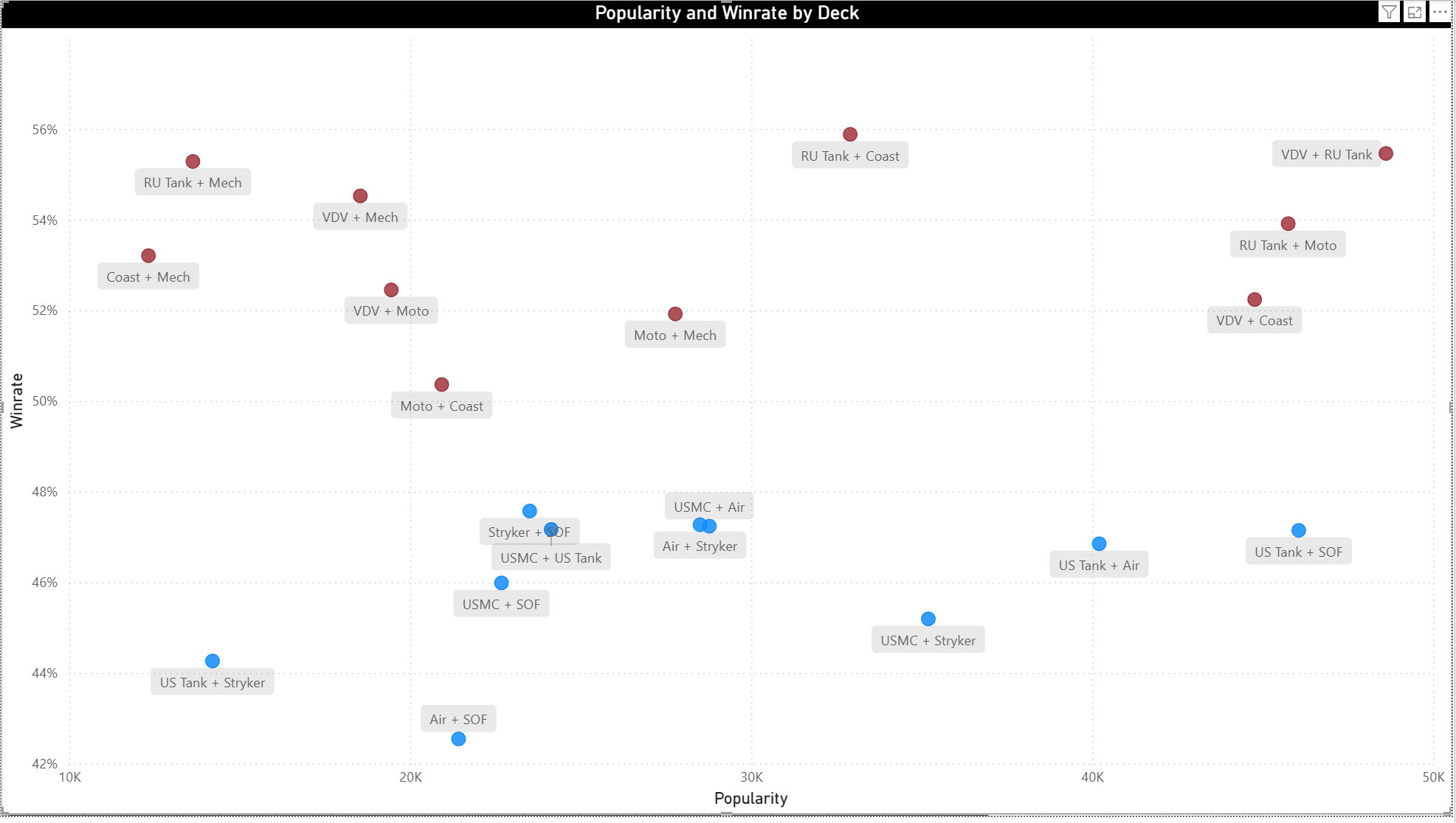 The next chart presents the distribution of all available specialization combinations by win rate and popularity. We invite you to share your conclusions in the comments ? your thoughts and suggestions for improving balance are highly valuable. Please note that in this context, ?popularity? refers to how often a specialization is chosen, not its combat effectiveness.