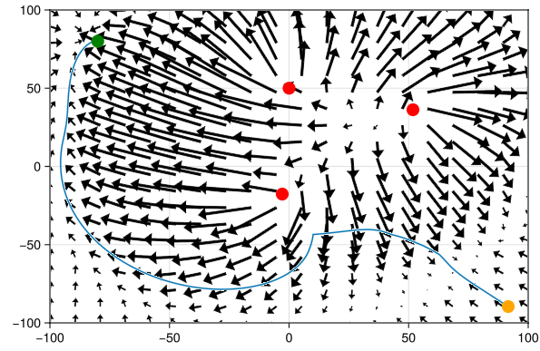 Pictured: experimental AI logic built inside the scriptable AI Framework for transiting Ship A (yellow) past Threats X, Y, and Z (red) to Destination B (green). Weighted threat values (black arrows) for each detected/classified red Threat influence the pathing decisions for Ship A (yellow). Ship A (yellow) is simulated Kidd class DDG, while Threat X (top) is simulated Oslo class FF, Threat Y (top right) is simulated Belknap class CG, and Threat Z (bottom) is simulated Sovremenny class DDG. The sharp turn to the south on classification of Threat Z (Sovremenny) is due to AI understanding of the greater anti-ship threat posed by Sovremenny with its highly capable SS-N-22 missiles.