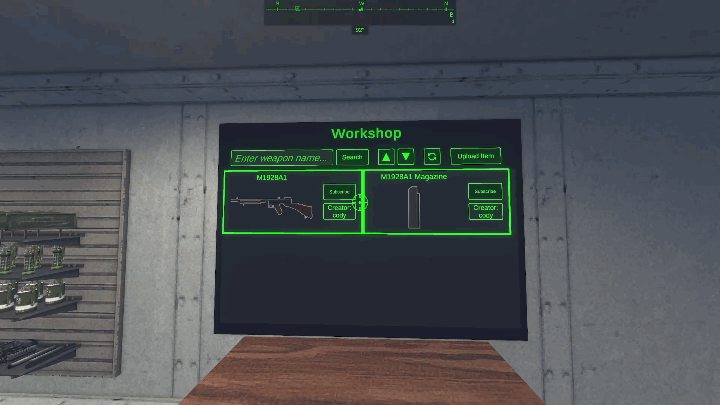 You'll be able to upload weapons to the Steam Workshop for others to use.  Magazines can be shared so a weapon you make can use a magazine that already exists in the game, or one someone else made.  We're still working to improving the workflow, UI, and general polish.