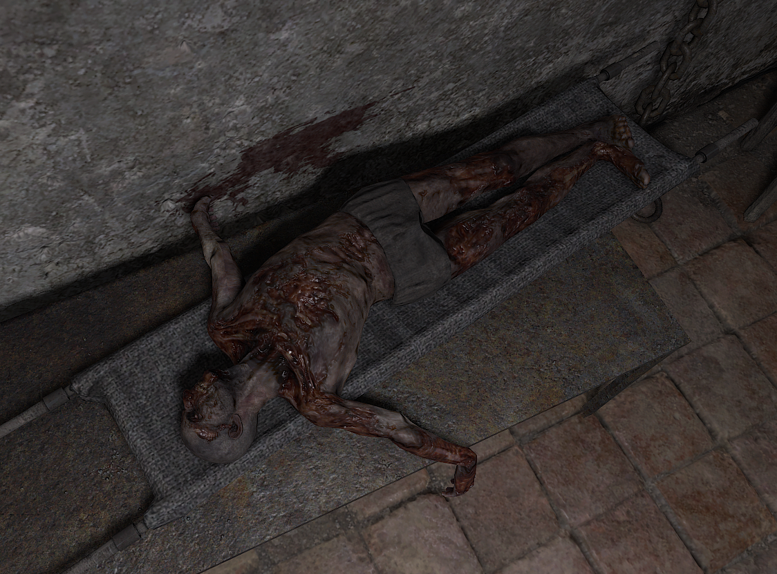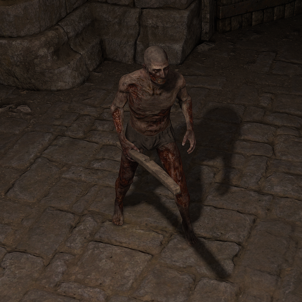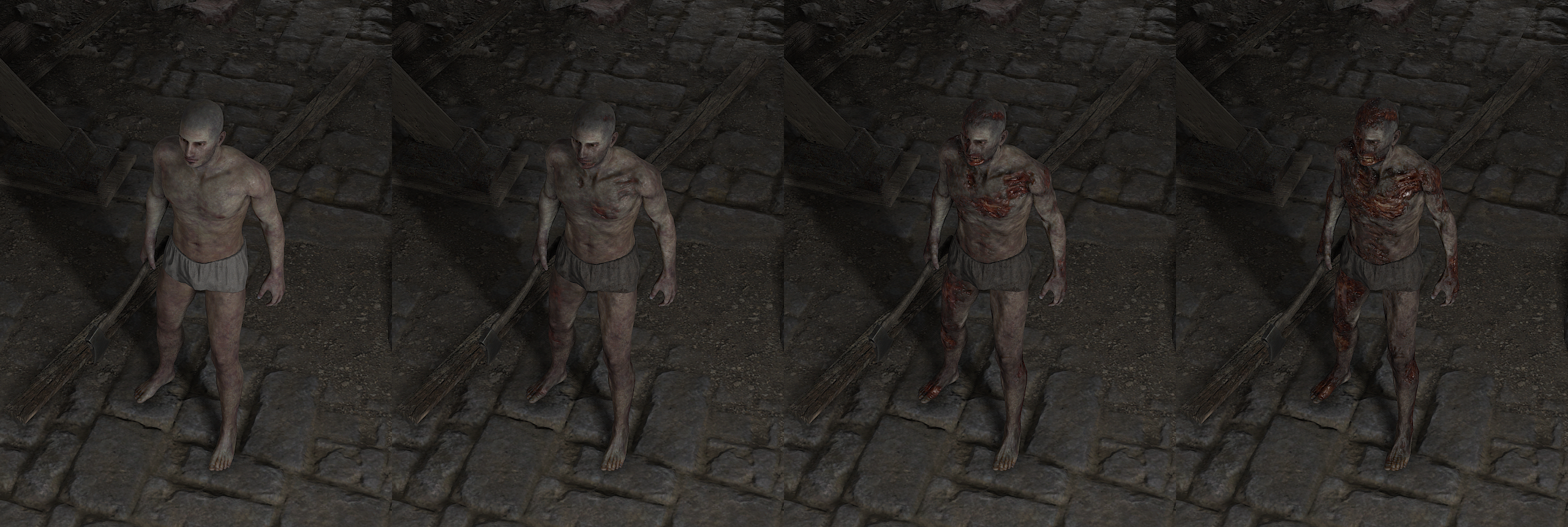 Speaking of procedural characters, long ago we teased some experiments we did with deep wounds on undead exposing flesh, organs and bones. That was just a rough concept and required a fair amount of work to actually make it into an in-game feature, but we finally got round to it. We've made many changes to the procedural decomposition, but this is the main addition. There's a number of decomposition effects that change including the extent of the wounds, and the patterns of the wounds and other effects are unique to each individual. Here's some screenshots showing some levels of decomposition and different examples.