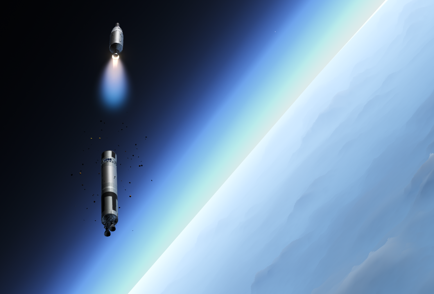 I am continuing my pursuit of improving the plumes in the Mercury and Gemini ascent. These are quite simple but will adjust itself as the rocket climbs. You can see that the plume isn't static. Its size and shape is dynamic and will look different at lower altitudes compared to higher altitudes.