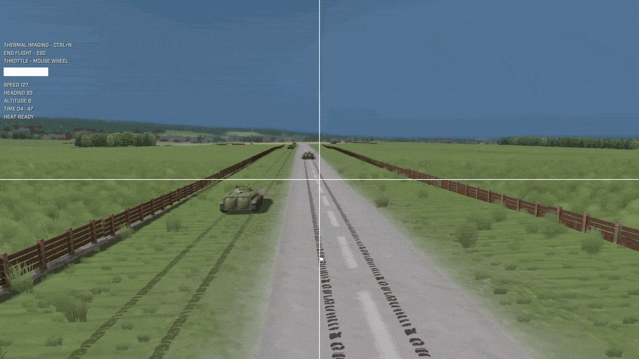 Take direct control of experimental FPV kamikaze drones and strike enemy vehicles from a first-person perspective. Use the crosshair to guide your attack, adjust throttle with the mouse wheel, and switch to thermal imaging to acquire targets—then crash into them with a HEAT warhead for maximum effect.