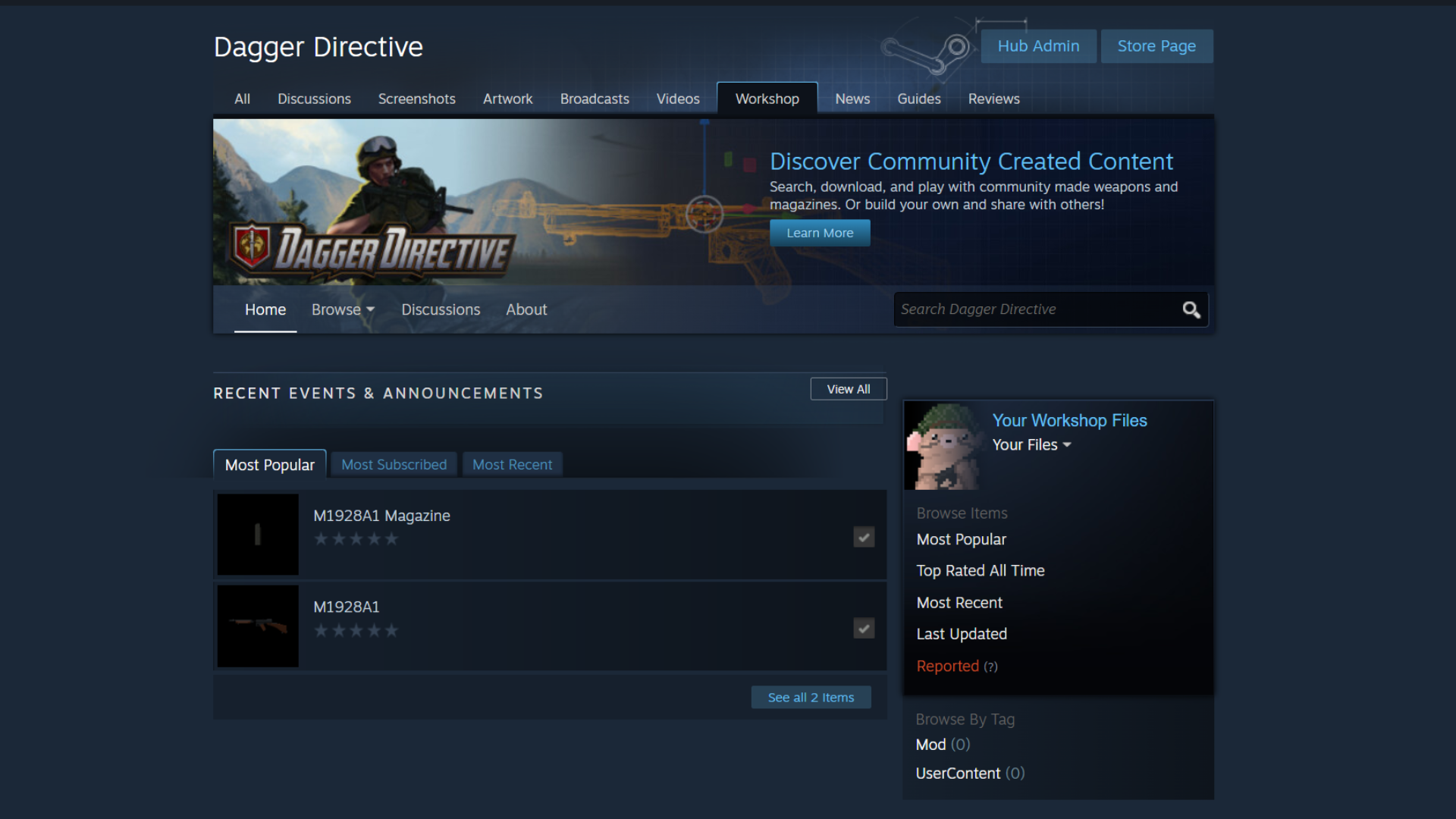 You can now create, share, and play with custom weapons and magazines through the Steam Workshop.  We've created templates and guides to help get you started creating weapons and magazines.  You'll also find the M1928 Thompson and a 20 round magazine on the Workshop.